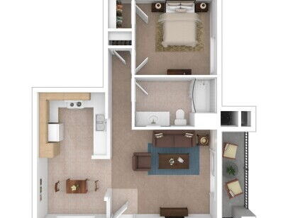 Our Crestview floor plan offers a spacious bedroom, fully-equipped kitchen, and a private patio or balcony.